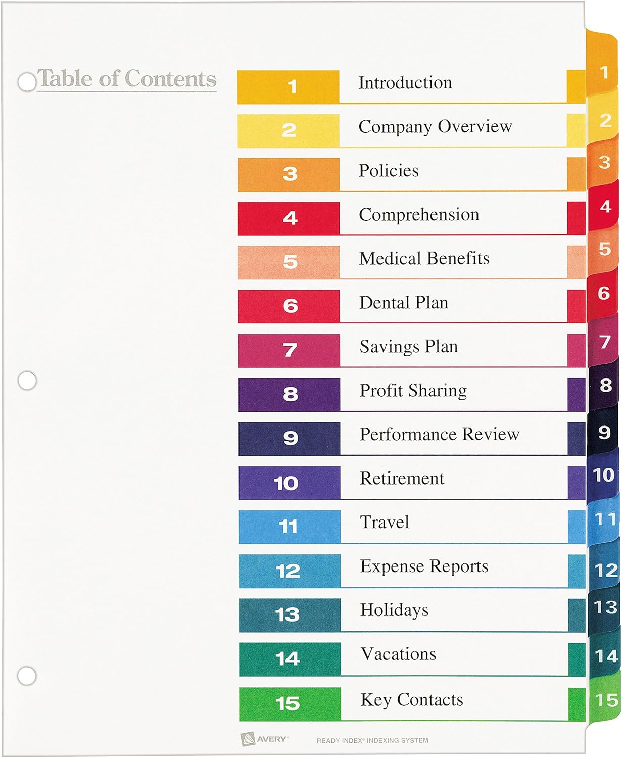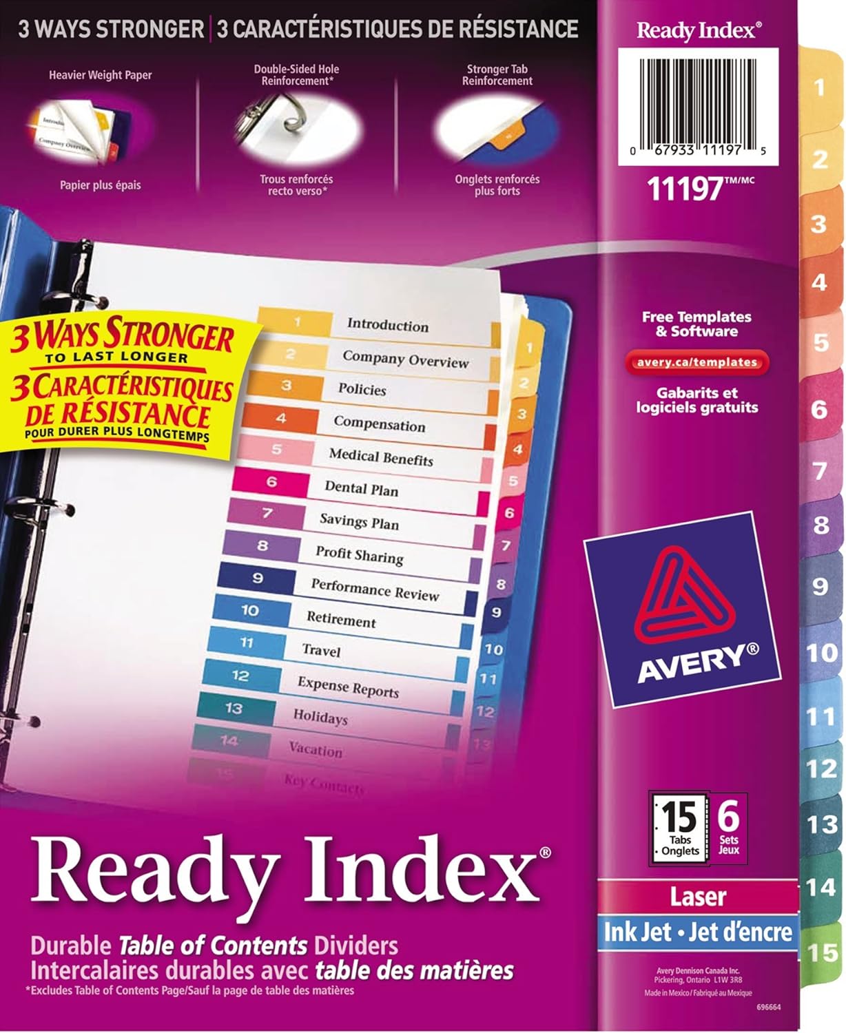 Get business plans or projects organized with colourful dividers. Easily sort important documents with 15 pre-printed, numbered, multi-colour tabs and a table of contents page that are three-hole punched for easy reference. With free templates available, you can customize the table of contents page and print with your laser or inkjet printer in no time using the Avery Design & Print Online Software. Ready Index Dividers feature stronger heavier paper, stronger tab reinforcements and double-sided hole reinforcements to prevent tearing, to ensure dividers will last. Dividers made from 20% post-consumer recycled paper. Dividers can also be used in portrait or landscape formats to suit your presentation. Ready Index Dividers are the dependable way to create organized binders and customized reports conveniently from your computer.