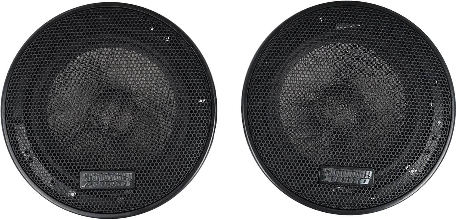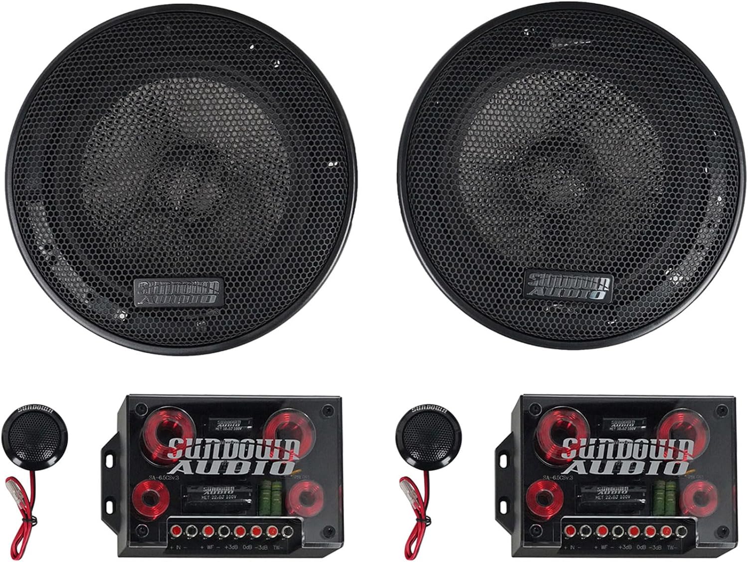 The Sundown Audio SA-6.5CS v.3 component speaker bundle includes two matched pairs of 6.5" component speaker systems rated at 125-Watts per side. Each set includes a midrange driver, silk dome tweeter, and passive crossover network designed for vehicle audio installations.The midrange driver uses a cast aluminum frame, paper and wool fiber cone blend, rubber surround, and vented motor structure with optimized magnetic gap and voice coil collar. The mounting depth is 2.87" and the cutout diameter is 5.63", supporting installation in compatible factory and aftermarket speaker locations.Key features and benefits: (2) Pair SA-6.5CS v.3 6.5" component speaker systems Rated 125-Watts per side Paper and wool fiber cone blend with rubber surround Cast aluminum midrange frame Silk dome tweeters with machined aluminum housing Passive crossover centered at 3800 Hz Adjustable tweeter level settings: 0 dB, -3 dB, -6 dB Mounting depth: 2.87"; cutout diameter: 5.63"This bundle provides two pairs of component speakers with separate midrange drivers, tweeters, and crossovers suitable for vehicle audio systems requiring component speaker installation and adjustable crossover tuning.